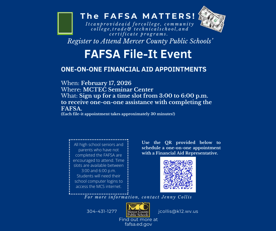 Due to weather, we have postponed our FAFSA Workshop until February. Mercer County Schools will be holding a workshop on February 17, 2026. If you would like assistance prior to that, just reach out and we will schedule a time at PSHS for you to come in and complete the FAFSA.